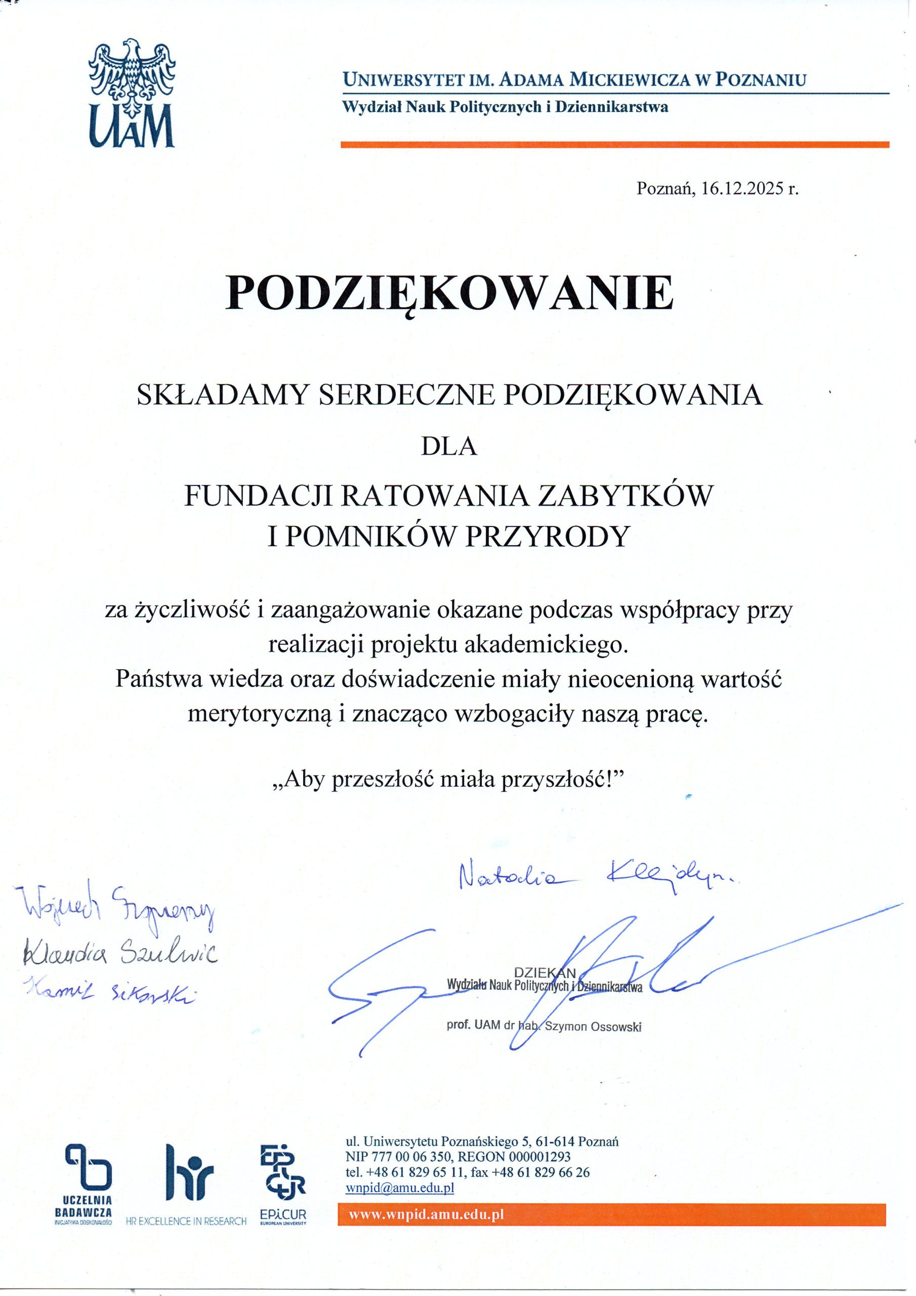 W listopadzie br. mieliśmy przyjemność gościć troje studentów kierunku „Bezpieczeństwo narodowe” poznańskiego Uniwersytetu im. Adama Mickiewicza. W ramach przedmiotu Ochrona zabytków, dóbr kultury i dziedzictwa narodowego pod kierunkiem dr hab. Natalii Klejdysz realizowali projekt „Społeczność dla dziedzictwa – lokalne inicjatywy ochrony zabytków”.